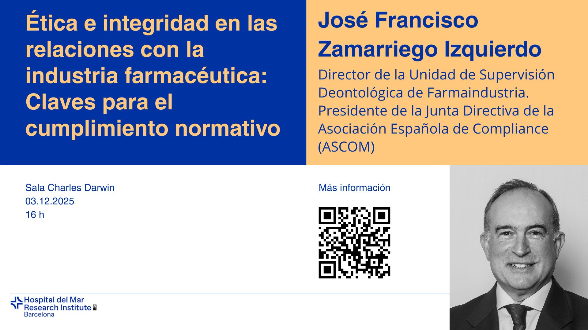 El próximo 3 de diciembre a las 16:00h tendrà lugar en la Sala Charles Darwin, el seminario “Ética e integridad en las relaciones con la industria farmacéutica: Claves para el cumplimiento normativo” a cargo del Dr. José Francisco Zamarriego, Director de la Unidad de Supervisión Deontológica de Farmaindustria y Presidente de la Junta Directiva de la Asociación Española de Compliance (ASCOM).
