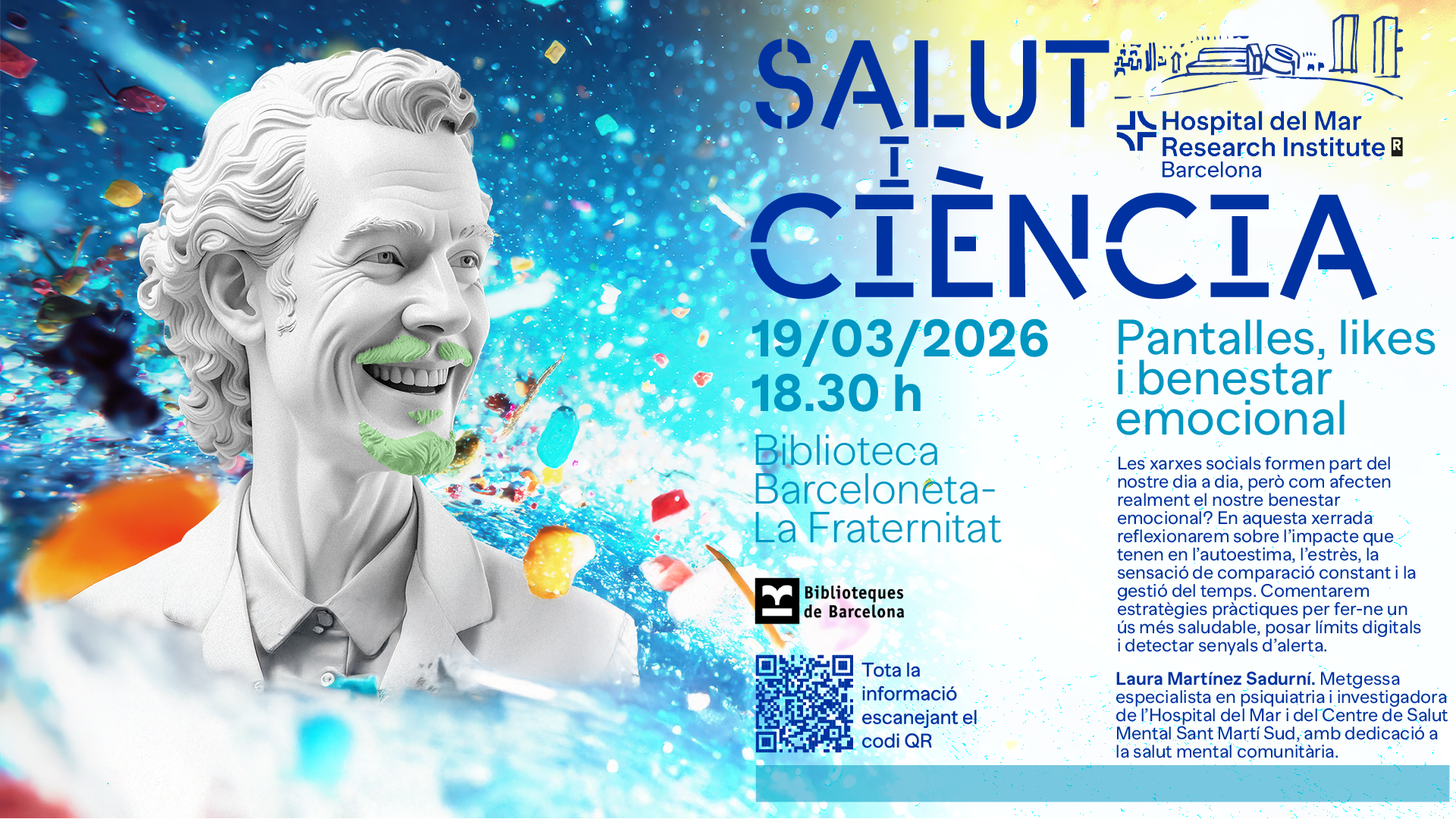 En el marc del Projecte Salut i Ciència en col·laboració amb les biblioteques de Barcelona, us convidem el proper dia 19 de març a la xerrada "Pantalles, likes i benestar emocional" a càrrec de Laura Martínez Sadurní, metgessa especialista en psiquiatria i investigadora de l'Hospital del Mar i del Centre de Salut Mental Sant Martí Sud, amb dedicació a la salut mental comunitària