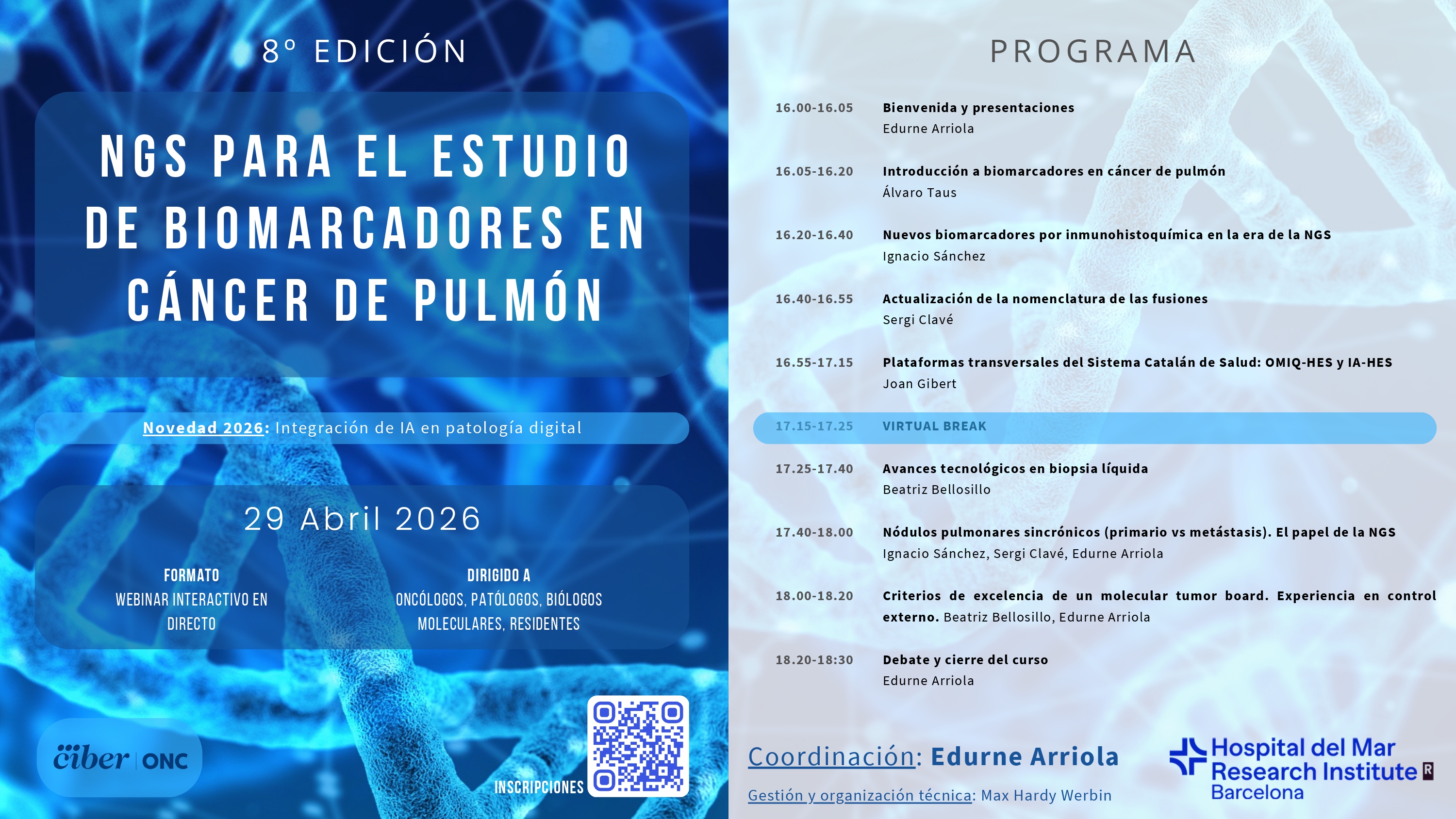 El próximo 29 de abril tendrá lugar la 8a edición del Curso "NGS para el estudio de biomarcadores en cáncer de pulmón" coordinado por la Dra. Edurne Arriola, jefa de sección del Servicio de Oncología Médica del Hospital del Mar e investigadora del Grupo de terapia molecular del cáncer del Hospital del Mar Research Institute.