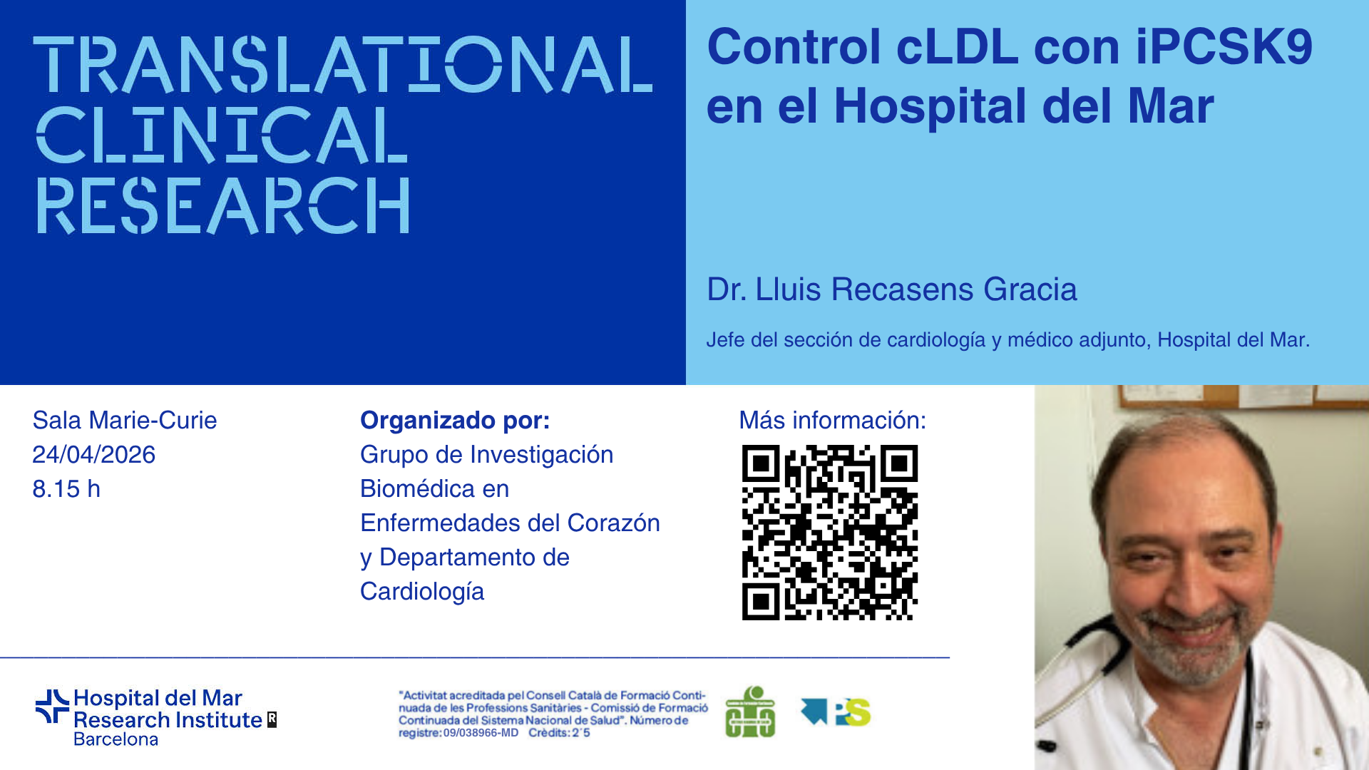 El títol serà “Control cLDL con iPCSK9 en el Hospital del Mar" i anirà a càrrec del Dr. Lluis Recasens Gracia, cap del servei de Cardiologia i metge adjunt de l'Hospital del Mar.
