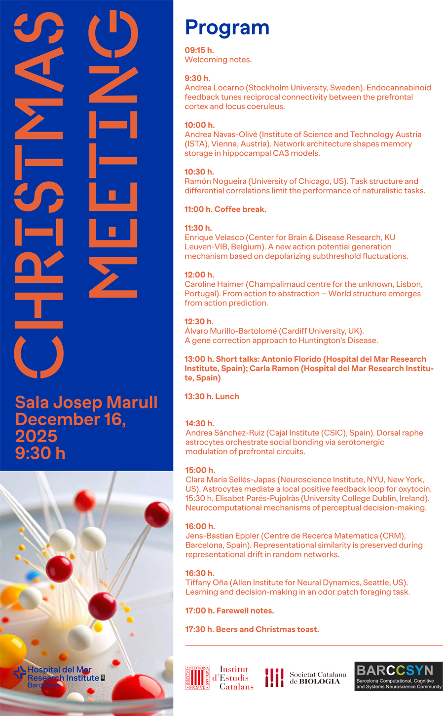 A new edition of the Christmas Meeting will take place next December 16th, aimed at postdoctoral researchers and young faculty from all fields of neuroscience. This meeting will provide an excellent opportunity to know our scientific community and explore possibilities to join it.