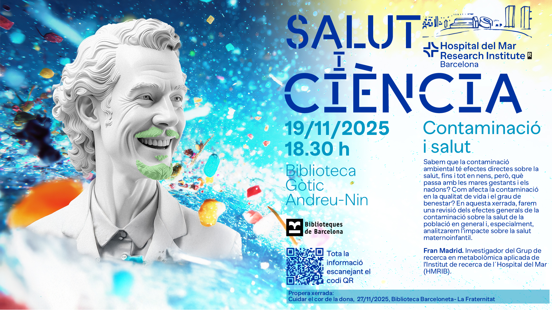 En el marc del Projecte Salut i Ciència en col·laboració amb les biblioteques de Barcelona, us convidem el proper dia 19 de novembre a la xerrada "Contaminació i salut" a càrrec de Fran Madrid, investigador del Grup de recerca en metabolòmica aplicada de l'Institut de recerca de l´Hospital del Mar (HMRIB).