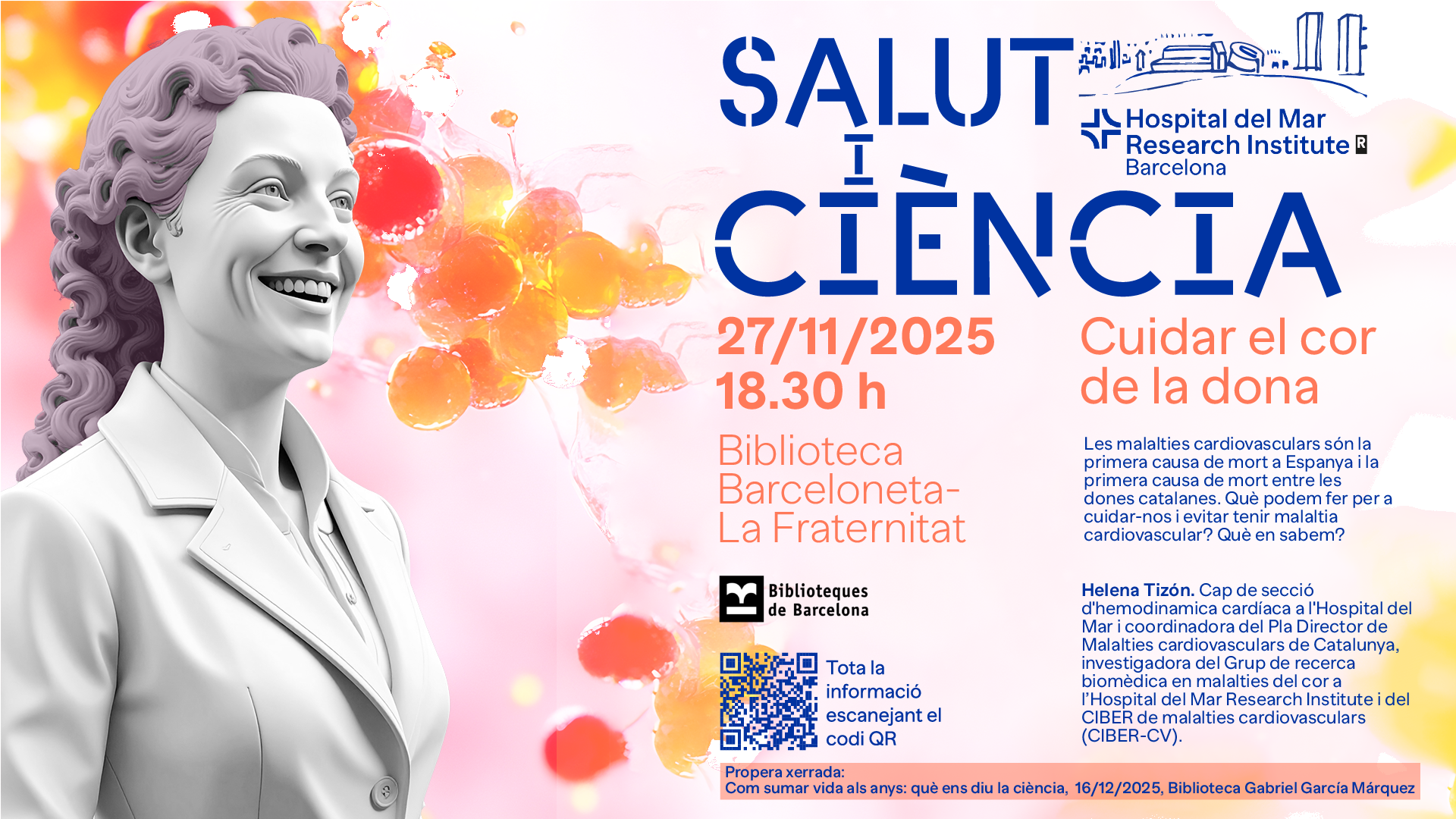 En el marc del Projecte Salut i Ciència en col·laboració amb les biblioteques de Barcelona, us convidem el proper dia 27 de novembre a la xerrada "Cuidar el cor de la dona" a càrrec d’Helena Tizón, cap de secció d'hemodinamica cardíaca a l'Hospital del Mar i coordinadora del Pla Director de Malalties cardiovasculars de Catalunya, investigadora del Grup de recerca biomèdica en malalties del cor a l'Hospital del Mar Research Institute i del CIBER de malalties cardiovasculars (CIBER-CV).