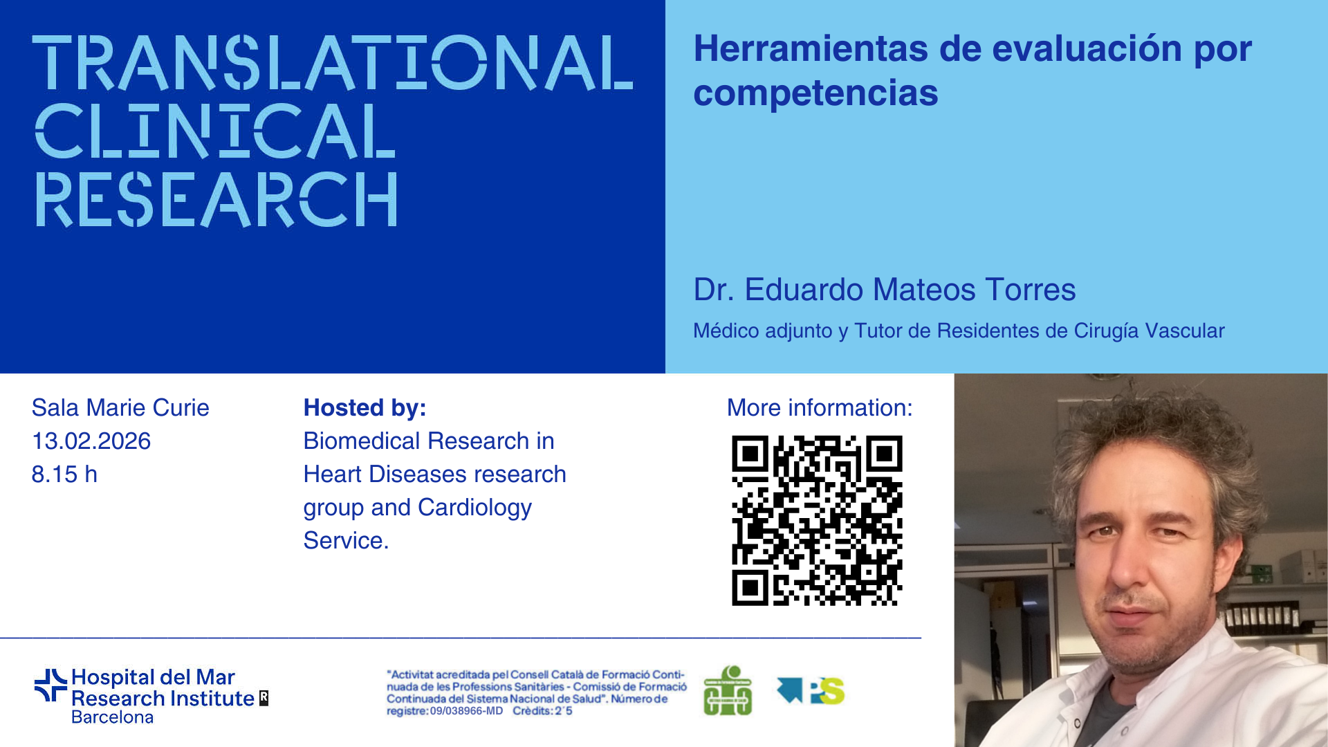 We invite you to the next joint seminar of the Cardiology Department of Hospital del Mar and the Biomedical Research in Heart Diseases Group of the Hospital del Mar Research Institute, which will take place on Friday, February 13, 2026, at 08:15 AM in the Marie Curie Room (PRBB).