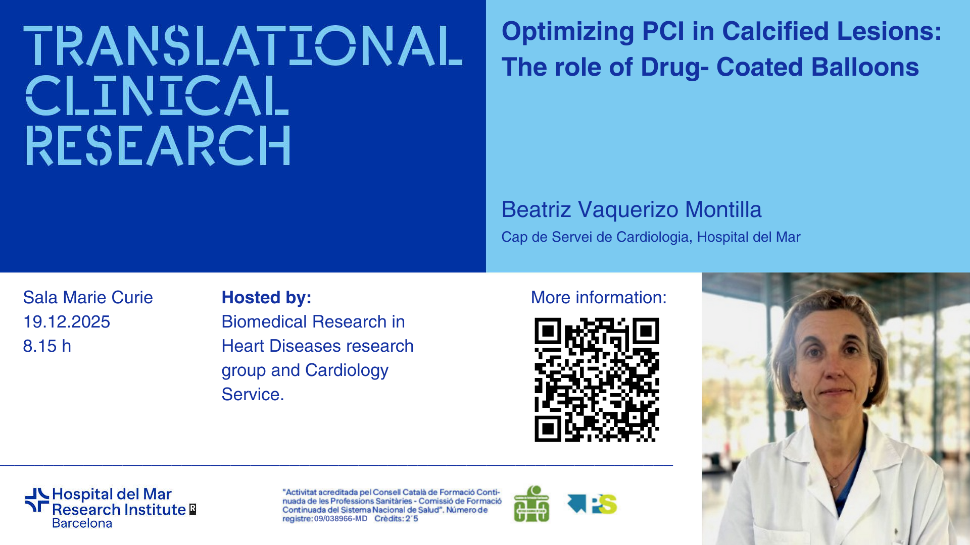 El títol serà "Optimizing PCI in Calcified Lesions: The role of Drug- Coated Balloons" i anirà a càrrec de Beatriz Vaquerizo Montilla, Cap de Servei de Cardiologia, Hospital del Mar.