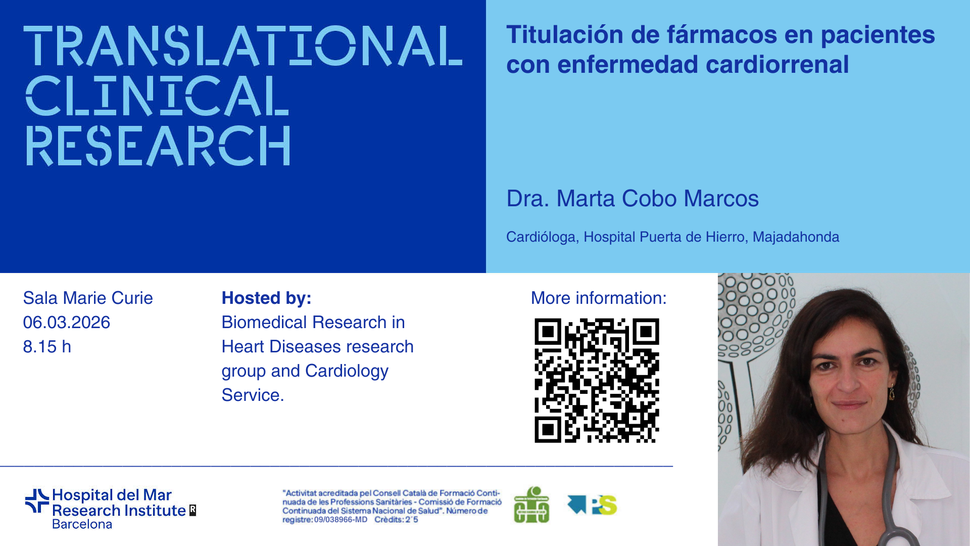 We invite you to the next joint seminar of the Cardiology Department of Hospital del Mar and the Biomedical Research in Heart Diseases Group of the Hospital del Mar Research Institute, which will take place on Friday, February 6, 2026, at 08:15 AM in the Marie Curie Room (PRBB).