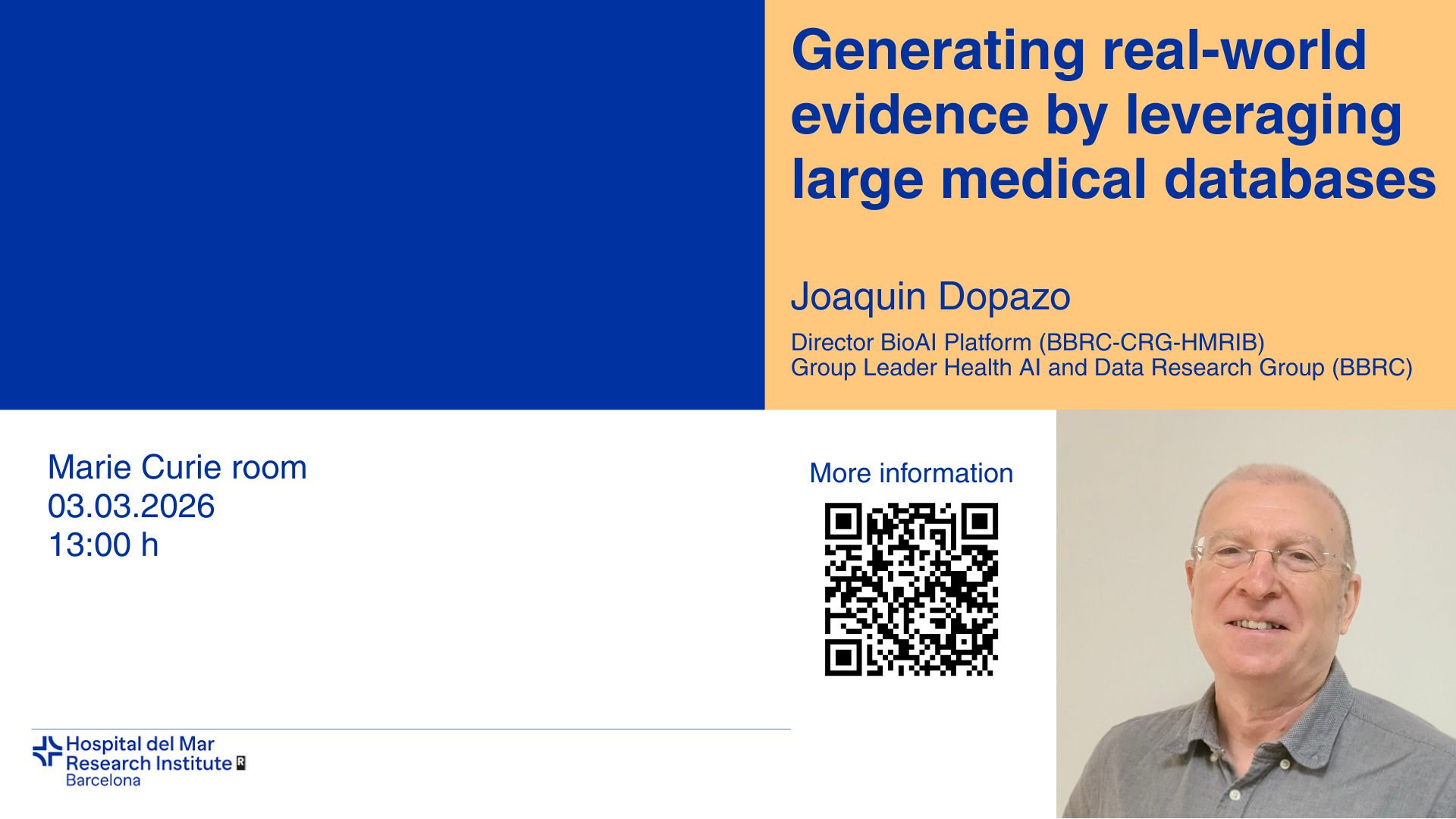 Us convidem al pròxim seminari que tindrà lloc el dimarts 03/03/2026 a les 13:00h a la Sala Marie Curie. El seminari anirà a càrrec de Joaquin Dopazo, Director de la Plataforma BioAI (BBRC-CRG-HMRIB), Cap del Grup de Recerca en IA i Dades en Salut (BBRC). Porta per títol "Generating real-world evidence by leveraging large medical databases".