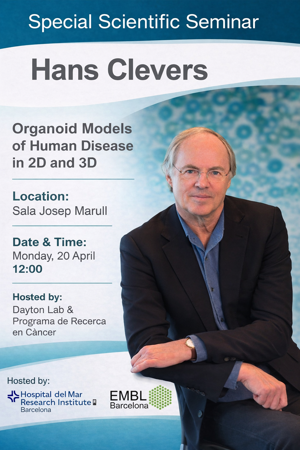 Us convidem al pròxim seminari organitzat pel programa de Recerca en Càncer de l'Institut de Recerca de l'Hospital del Mar i Dayton Lab de l'EMBL (European Molecular Biology Laboratory), que tindrà lloc el dilluns 20/04/2026 a les 12:00h a la Sala Josep Marull. El seminari constarà a càrrec de Hans Clevers, professor i cap de grup de Clevers Group, d'Hubrecht Institute, amb el títol "Organoid Models of Human Disease in 2D and 3D".