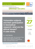 En el marc de les sessions d'Epidemiologia i Salut Pública de l'IMIM, el proper 27 de novembre a les 15:00 hores a la Sala Xipre (173.06), tindrà lloc la sessió que porta per títol "Vulnerable subjects and their participation in biomedical research: what are the ethical issues? A case study" a càrrec de Jordi Delclòs de l'Escola de Salut Pública de la Universitat de Texas de Houston, Texas i investigador del Centre de Recerca en Salut Ocupacional (CISAL) de la Universitat Pompeu Fabra.