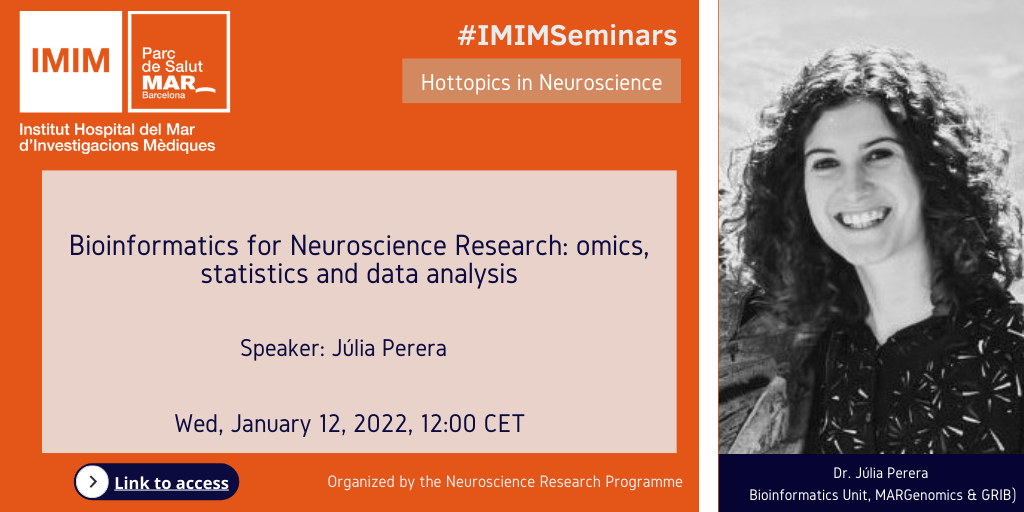 We invite you to the next IMIM Seminar on Hottopics in Neuroscience that will take place on Wednesday 12/1/2022 at 12:00 h. Dr. Júlia Perera (Bioinformatics Unit, MARGenomics & GRIB) will talk about "Bioinformatics for Neuroscience Research: omics, statistics and data analysis"