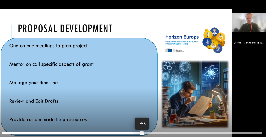 Chris George, desarrollador de propuestas de la RGCO, presentó las oportunidades de financiación nacionales e internacionales disponibles para los investigadores postdoctorales. Compartió consejos prácticos para preparar solicitudes del programa Horizon Europe y detalló los servicios de apoyo que ofrece la RGCO.