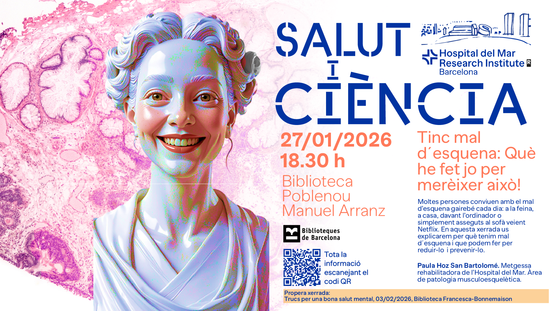 En el marc del Projecte Salut i Ciència en col·laboració amb les biblioteques de Barcelona, us convidem el proper dia 27 de gener a la xerrada "Tinc mal d´esquena: Què he fet jo per merèixer això!" a càrrec de Paula Hoz San Bartolomé, Metgessa rehabilitadora de l'Hospital del Mar, Àrea de patologia musculoesquelètica.