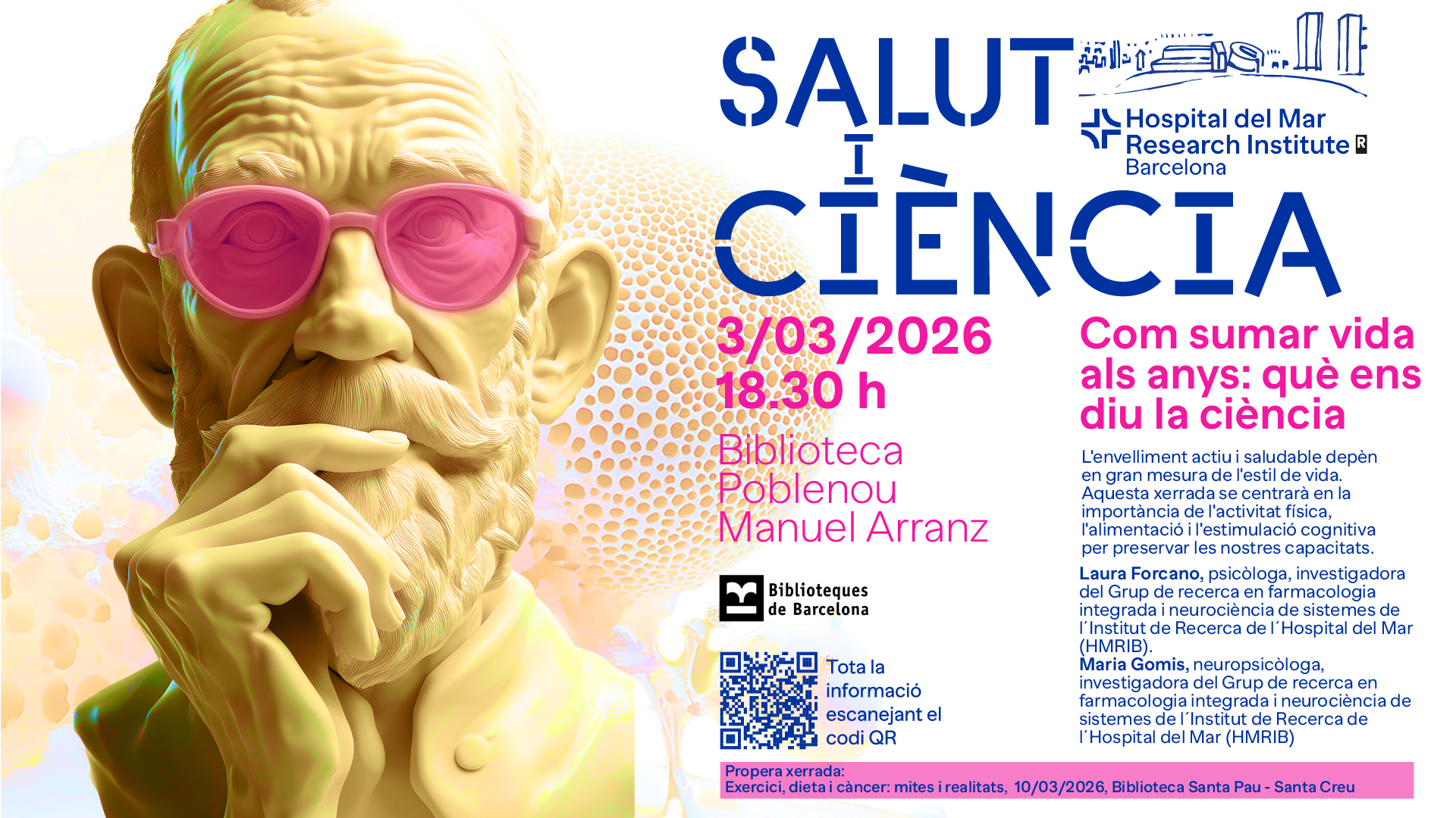 En el marc del Projecte Salut i Ciència en col·laboració amb les biblioteques de Barcelona, us convidem el proper dia 3 de març a la xerrada "Com sumar vida als anys: què ens diu la ciència" a càrrec de Laura Forcano, psicòloga, investigadora del Grup de recerca en farmacologia integrada i neurociència de sistemes de l’Institut de Recerca de l´Hospital del Mar (HMRIB) i Maria Gomis, neuropsicòloga, investigadora del Grup de recerca en farmacologia integrada i neurociència de sistemes de l´Institut de Recerca de l´Hospital del Mar (HMRIB)
