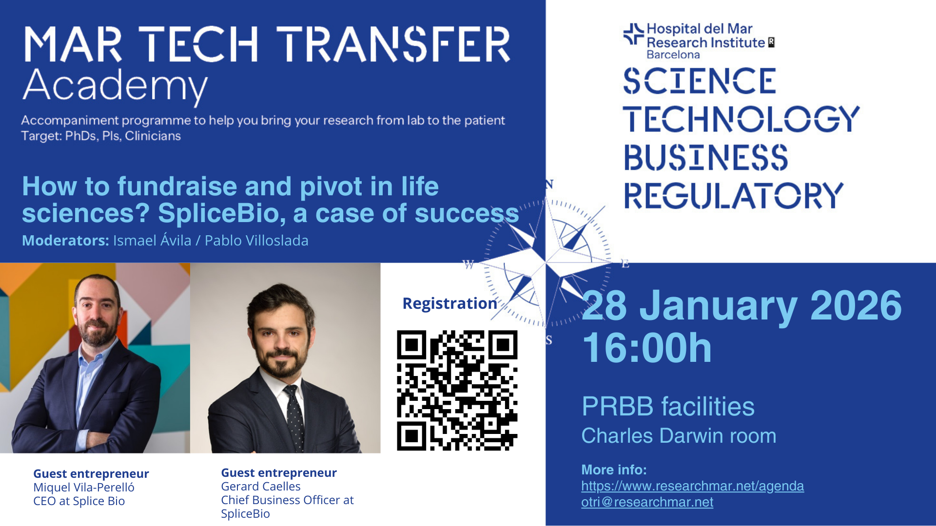 The first session will take place on January 28 at 4:00 pm and is entitled "How to fundraise and pivot in life sciences? SpliceBio, a case of success", delivered by Miquel Vila-Perelló, CEO of SpliceBio and Gerard Caelles, Chief Business Officer of SpliceBio. The session will be moderated by Ismael Ávila, Head of the Technology Transfer and Translation Unit at HMRIB, and Pablo Villoslada, Director of the Neurosciences Program also at HMRIB. The session will present the success story of SpliceBio, a benchmark example of fundraising in the life sciences ecosystem and of adaptability to change.