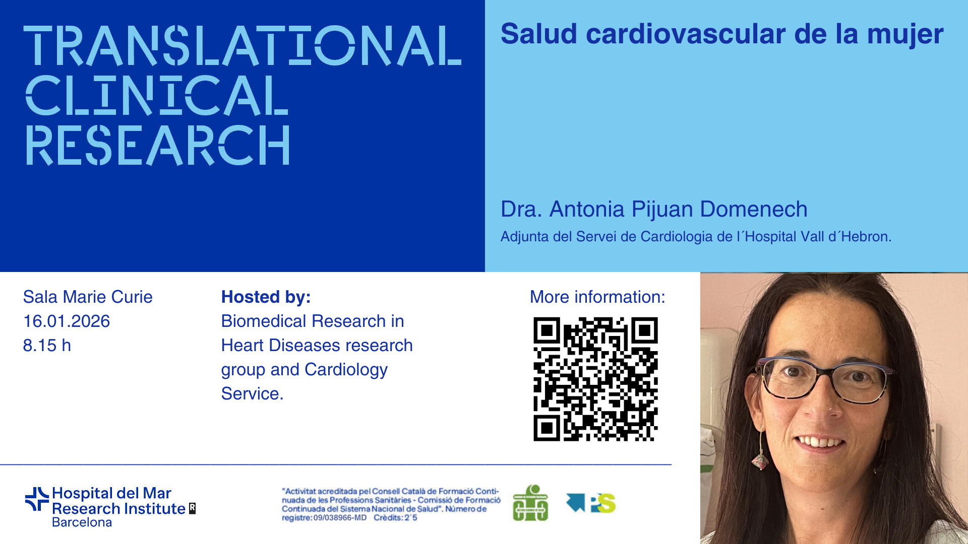 We invite you to the next joint seminar of the Cardiology Department of Hospital del Mar and the Biomedical Research in Heart Diseases Group of the Hospital del Mar Research Institute, which will take place on Friday, January 16, 2026, at 08:15 AM in the Marie Curie Room (PRBB).