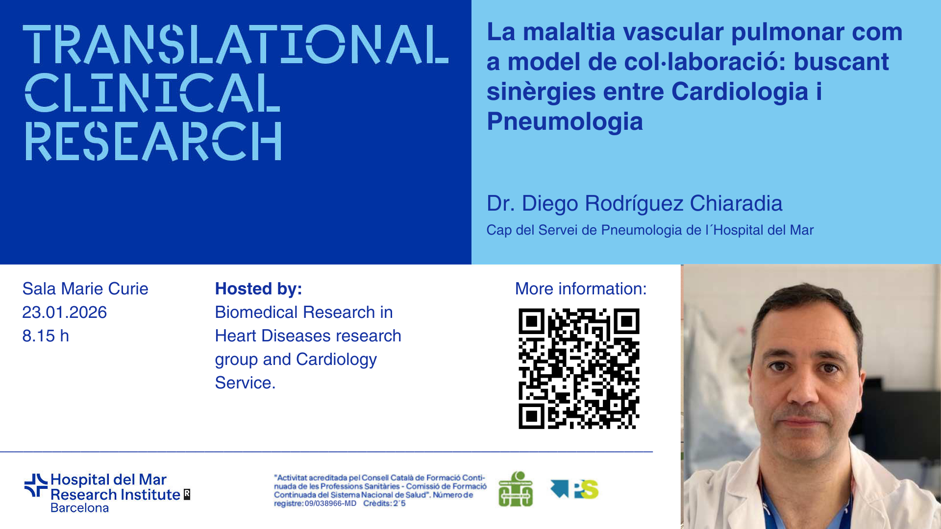 We invite you to the next joint seminar of the Cardiology Department of Hospital del Mar and the Biomedical Research in Heart Diseases Group of the Hospital del Mar Research Institute, which will take place on Friday, January 23, 2026, at 08:15 AM in the Marie Curie Room (PRBB).