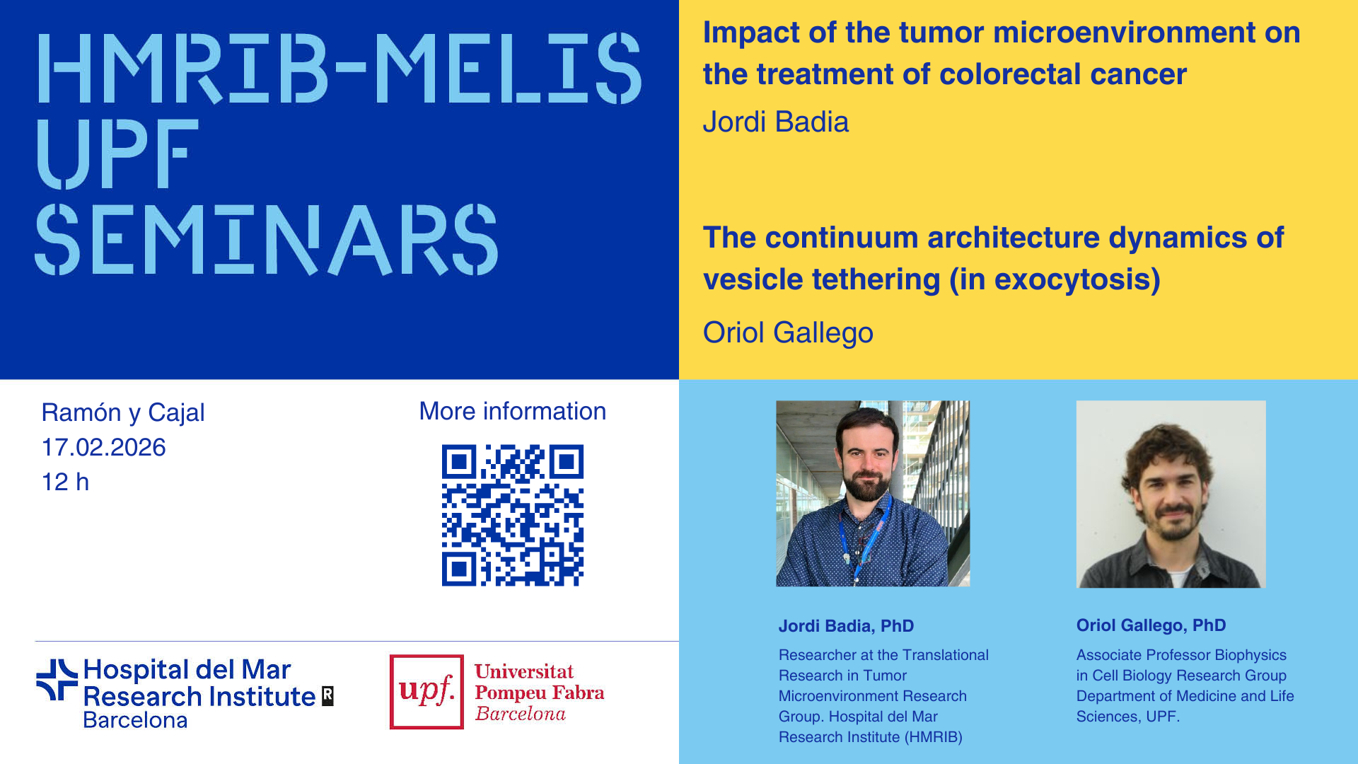 We invite you to the next Hospital del Mar Research Institute /MELIS UPF Seminar that will take place on Tuesday 17/02/2026 at 12:00h in the Ramón y Cajal Room. The seminar will consist of two talks, one by Jordi Badia, PhD, Researcher at the Translational Research in Tumor Microenvironment Research Group. Hospital del Mar Research Institute (HMRIB), with the title "Impact of the tumor microenvironment on the treatment of colorectal cancer" and the other by Oriol Gallego, PhD, Associate Professor, Biophysics in Cell Biology Research Group, Department of Medicine and Life Sciences, UPF, under the title "The continuum architecture dynamics of vesicle tethering (in exocytosis)".