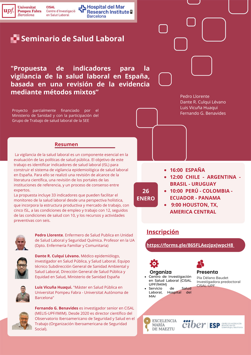 Os invitamos al próximo seminario del CISAL (Centro de Investigación en Salud Laboral) de la UPF y del Hospital del Mar Research Institute, que tendrá lugar el próximo lunes 26 de enero a las 16 h (hora de España) en formato virtual. El título será "Propuesta de indicadores para la vigilancia de la salud laboral en España, basada en una revisión de la evidencia mediante métodos mixtos".