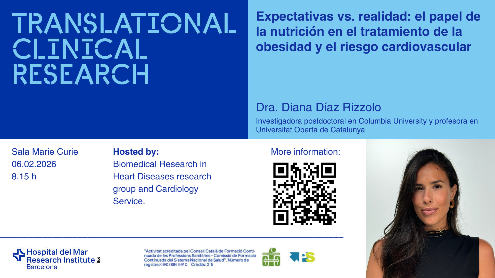 We invite you to the next joint seminar of the Cardiology Department of Hospital del Mar and the Biomedical Research in Heart Diseases Group of the Hospital del Mar Research Institute, which will take place on Friday, February 2, 2026, at 08:15 AM in the Marie Curie Room (PRBB).