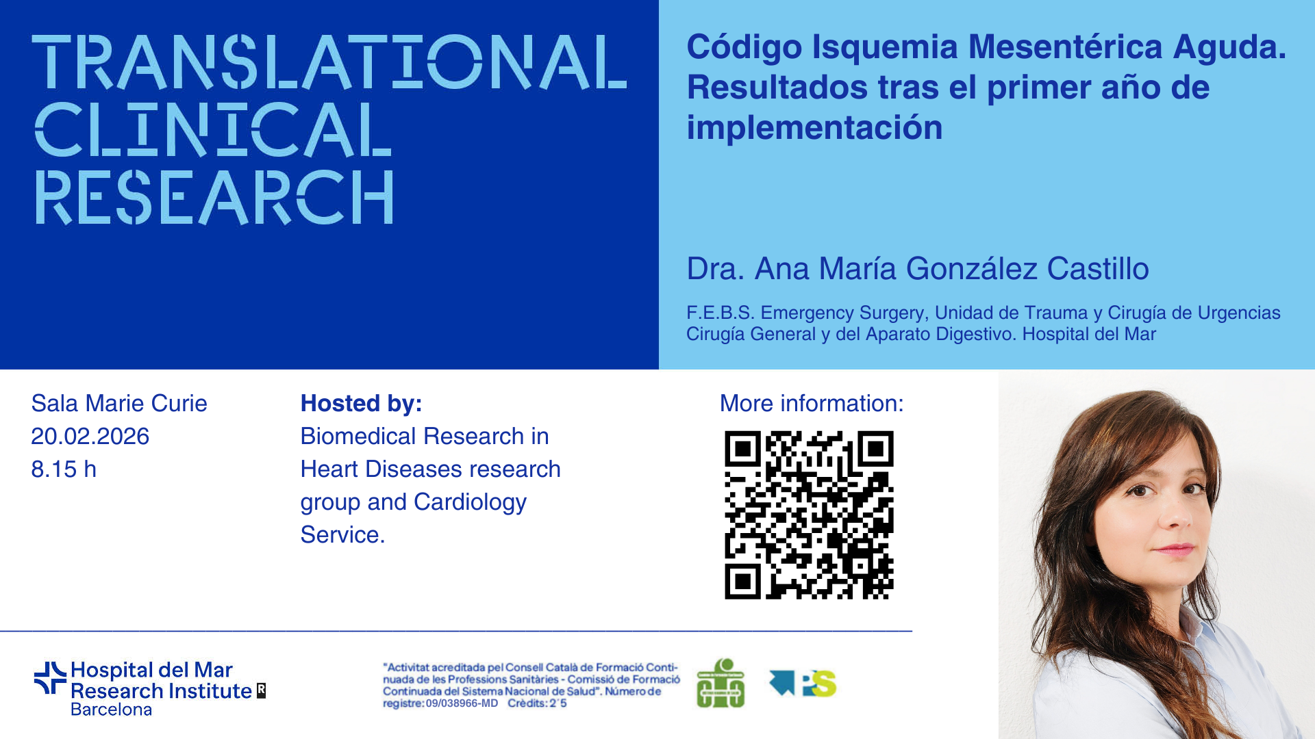 We invite you to the next joint seminar of the Cardiology Department of Hospital del Mar and the Biomedical Research in Heart Diseases Group of the Hospital del Mar Research Institute, which will take place on Friday, February 20, 2026, at 08:15 AM in the Marie Curie Room (PRBB).