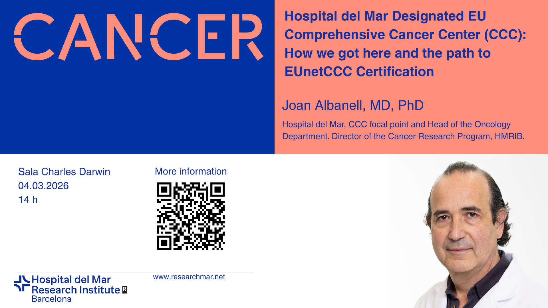 We invite you to the next seminar organized by the Cancer Research Program, which will take place on Wednesday, 04/03/2026, at 2:00 pm in the Charles Darwin Room. The seminar will feature a talk by Joan Albanell, MD, PhD, Hospital del Mar, CCC focal point and Head of the Oncology Department Director of the Cancer Research Program, HMRIB, entitled "Hospital del Mar Designated EU Comprehensive Cancer Center (CCC): How we got here and the path to EUnetCCC Certification".