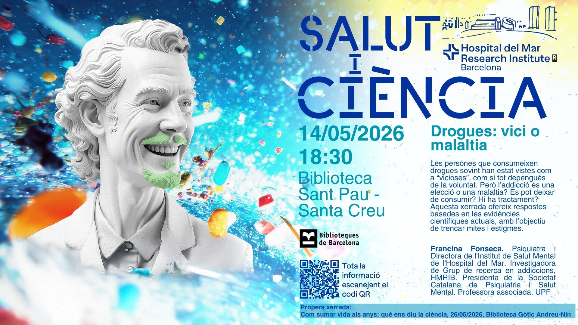 En el marc del Projecte Salut i Ciència en col·laboració amb les biblioteques de Barcelona, us convidem el proper dia 28 d'abril a la xerrada "Drogues: vici o malaltia" a càrrec de Francina Fonseca, psiquiatra i Directora de l'Institut de Salut Mental de l'Hospital del Mar, investigadora del Grup de recerca en addiccions de l'Institut de recerca de l'Hospital del Mar, presidenta de la Societat Catalana de Psiquiatria i Salut Mental i professora associada Universitat Pompeu Fabra.