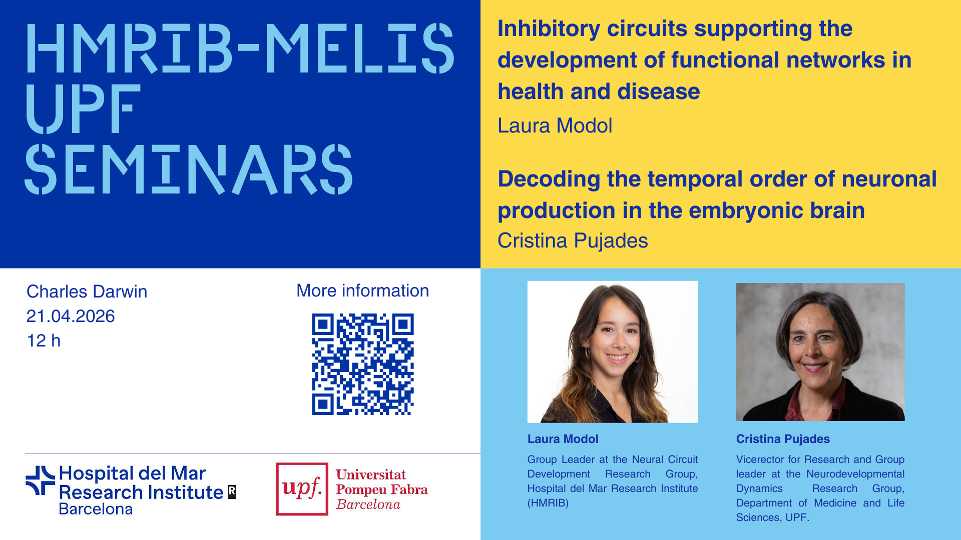 We invite you to the next Hospital del Mar Research Institute /MELIS UPF Seminar that will take place on Tuesday 21/04/2026 at 12:00h in the Charles Darwin Room. The seminar will consist of two talks, one by Laura Modol, Group Leader at the Neural Circuit Development Research Group, Hospital del Mar Research Institute (HMRIB), with the title "Inhibitory circuits supporting the development of functional networks in health and disease" and the other by Cristina Pujades, Vicerector for Research and Group Leader at the Neurodevelopmental Dynamics Research Group, Department of Medicine and Life Sciences, UPF, under the title "Decoding the temporal order of neuronal production in the embryonic brain".
