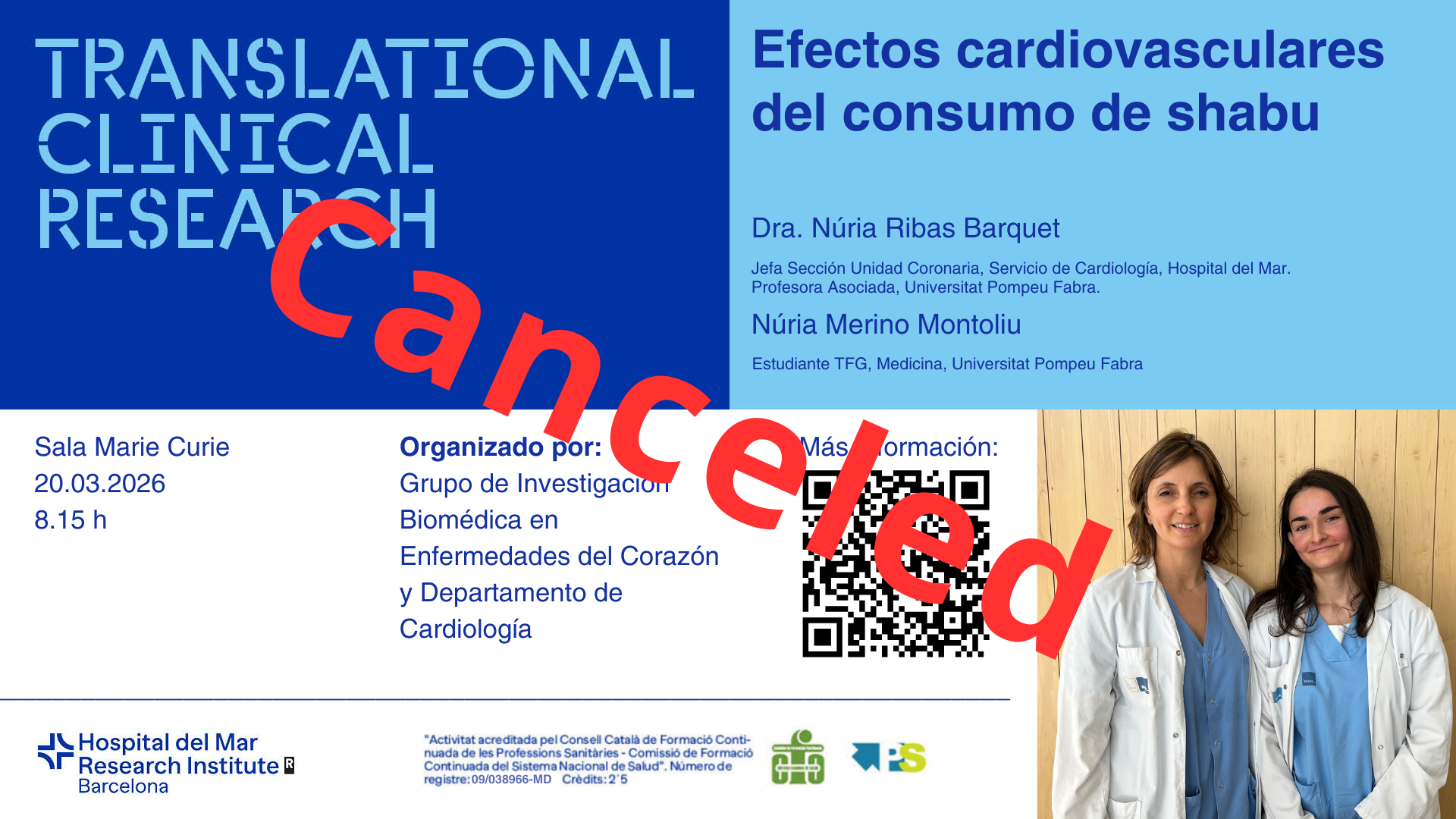 The seminar will be titled "Efectos cardiovasculares del consumo de shabu" and will be presented by Dr. Núria Ribas Barquet, Head of the Coronary Care Unit Section, Cardiology Department of Hospital del Mar, and Associate Professor at Pompeu Fabra University (GREC, IMIM), and Núria Merino Montoliu, a medical student completing her Bachelor's thesis in Medicine at Pompeu Fabra University.