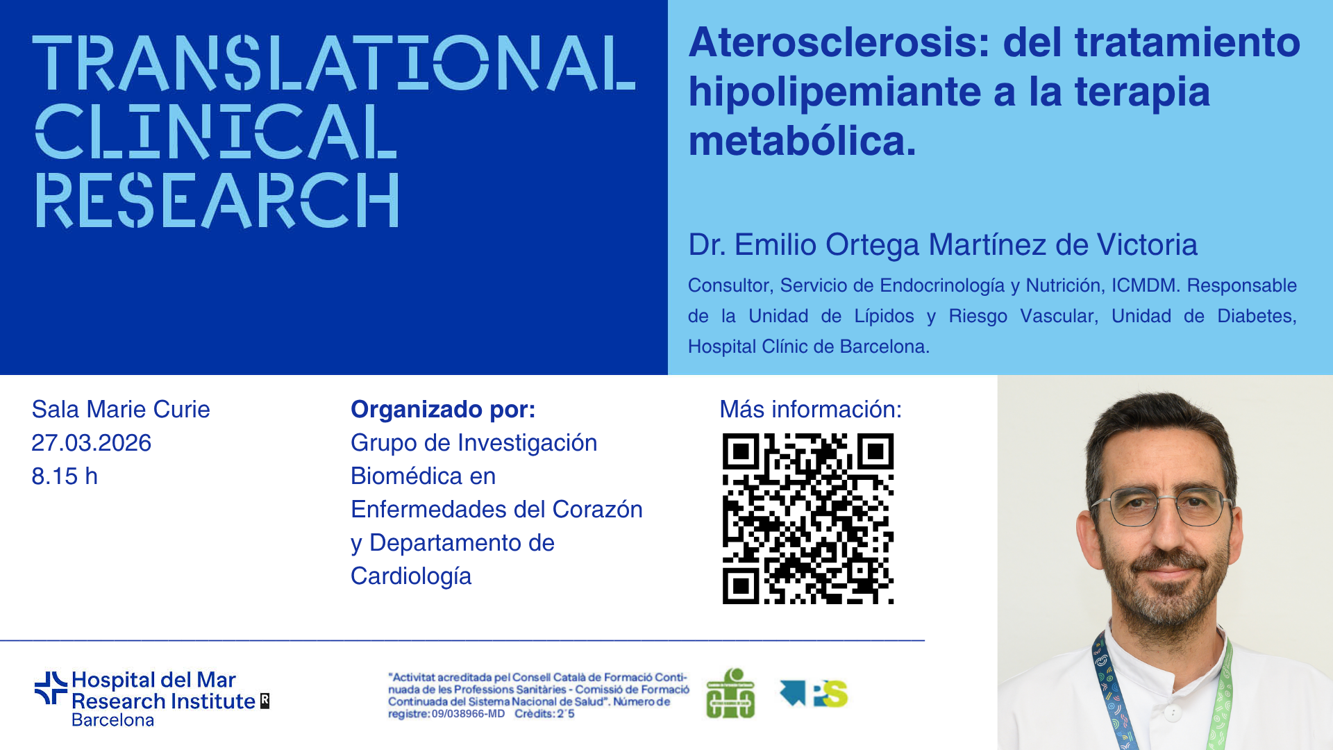 We invite you to the next joint seminar of the Cardiology Department of Hospital del Mar and the Biomedical Research in Heart Diseases Group of the Hospital del Mar Research Institute, which will take place on Friday, March 27, 2026, at 08:15 AM in the Marie Curie Room (PRBB).