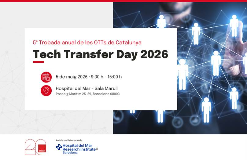S’apropa la propera edició del Tech Transfer Day 2026, la trobada anual de les Oficines de Transferència de Tecnologia i Innovació de la BioRegió de Catalunya, impulsada per Biocat. Enguany tindrà lloc el 5 de maig, de 9:30 a 15:00 h, a la Sala Marull de l'Hospital del Mar, i aquest any comptem amb la col·laboració de l'Hospital del Mar Research Institute Barcelona (HMRIB). La jornada es clourà amb un espai de networking amb pica-pica.