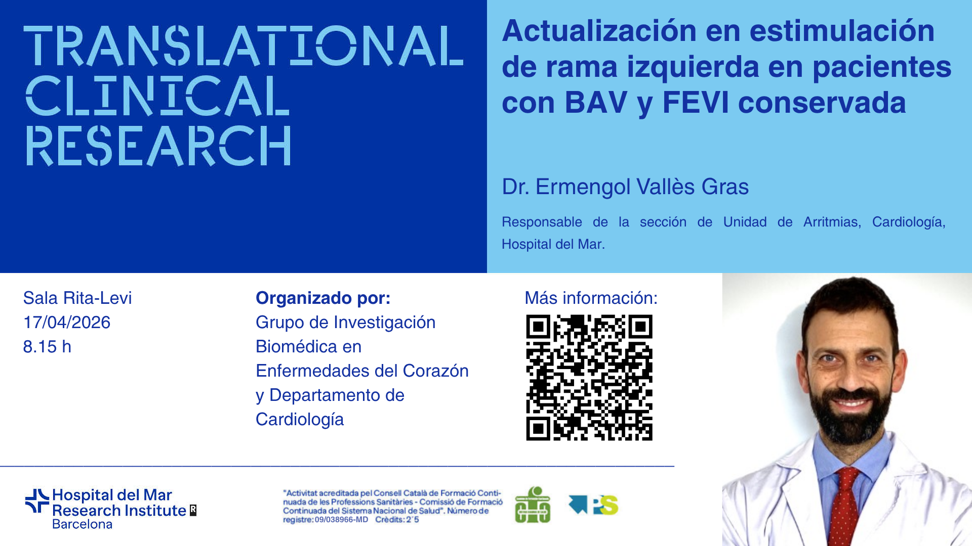 The seminar will be titled "Actualización en estimulación de rama izquierda en pacientes con BAV y FEVI conservada" and will be presented by Dr. Ermengol Vallès Gras, Head of the Arrhythmia Unit, Cardiology Department, Hospital del Mar.