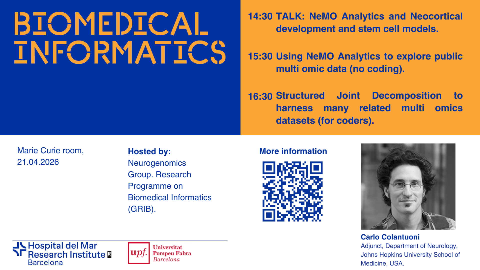 Us convidem al pròxim seminari organitzat pel programa de Informàtica Biomèdica que tindrà lloc el dimarts 21/04/2026 a les 14:30h a la Sala Marie Curie. El seminari serà a càrrec de Carlo Colantuoni, adjunt del Departament de Neurologia, Johns Hopkins University School of Medicine, EUA. Constarà de tres xerrades, d'una hora de durada cadascuna, la primera amb el títol "NeMO Analytics and Neocortical development and stem cell models" la segona amb el títol "Using NeMO Analytics to explore public multi omic data (no coding)" i la última amb el títol "Structured Joint Decomposition to harness many related multi omics datasets (for coders)".
