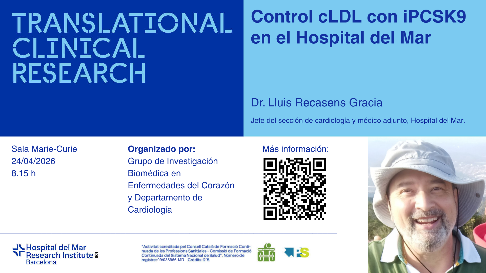 El títol serà “Control cLDL con iPCSK9 en el Hospital del Mar" i anirà a càrrec del Dr. Lluis Recasens Gracia, cap del servei de Cardiologia i metge adjunt de l'Hospital del Mar.