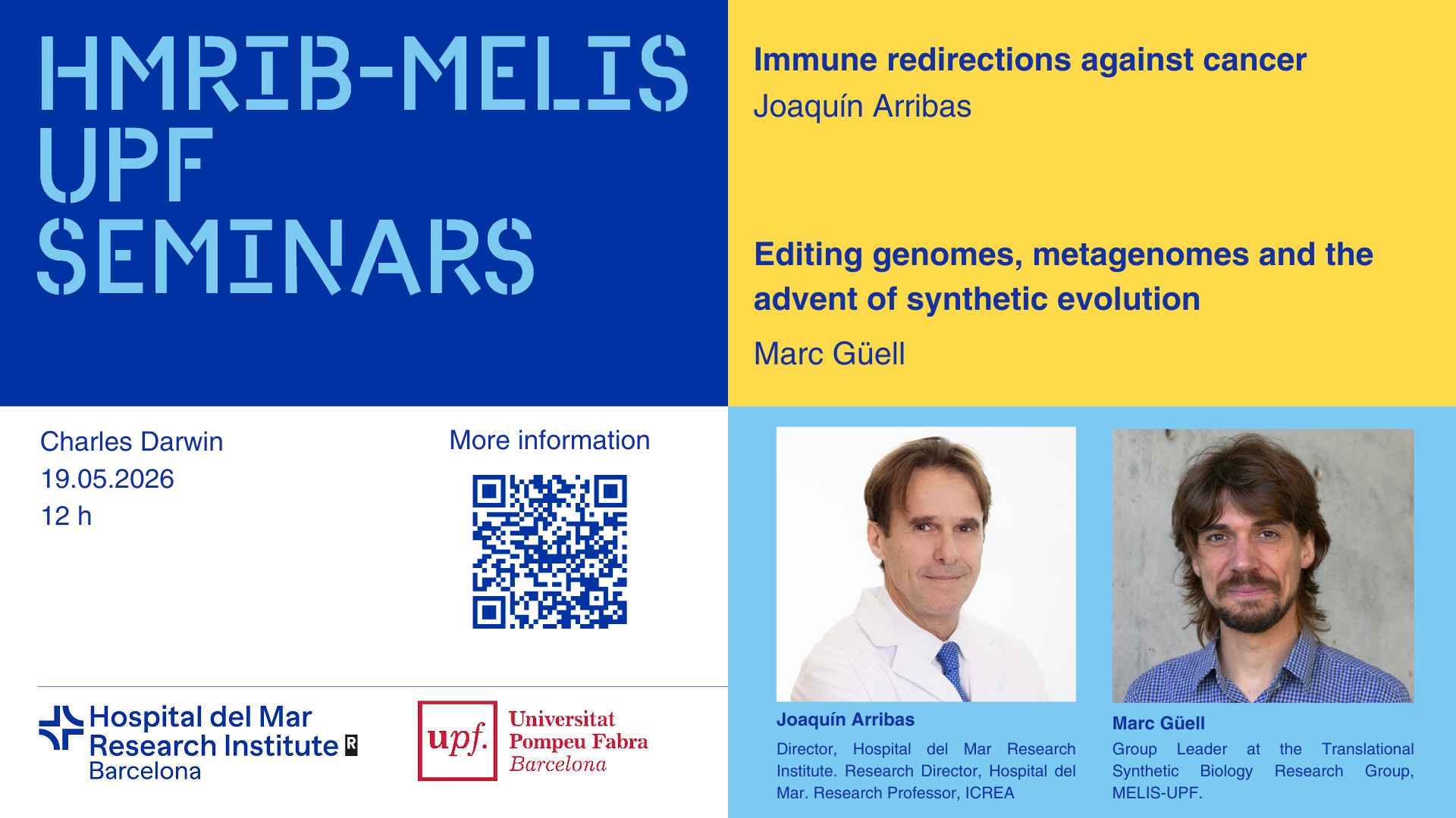 We invite you to the next Hospital del Mar Research Institute /MELIS UPF Seminar that will take place on Tuesday 19/05/2026 at 12:00h in the Charles Darwin Room. The seminar will consist of two talks, one by Joaquín Arribas, Hospital del Mar Research Institute (HMRIB), with the title "Immune redirections against cancer" and the other by Marc Güell, Group Leader at the Translational Synthetic Biology Research Group, MELIS-UPF, under the title "Editing genomes, metagenomes and the advent of synthetic evolution".