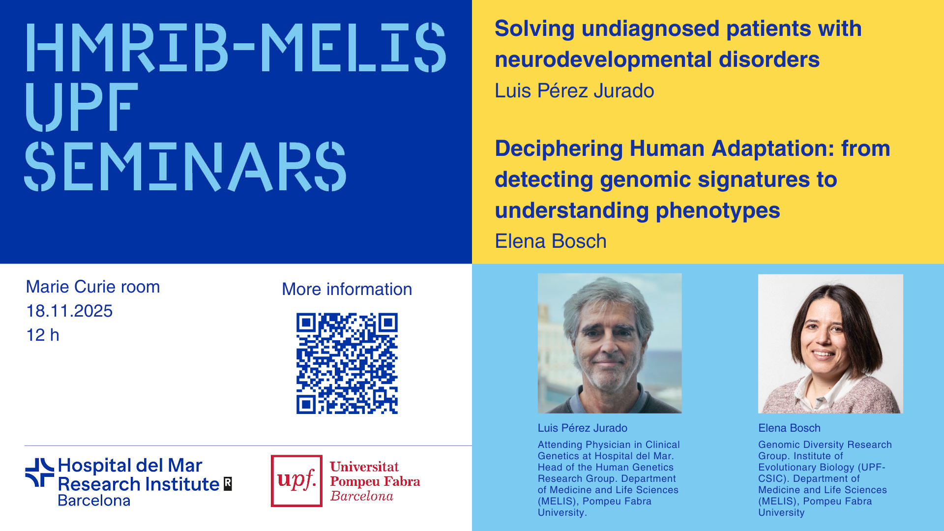 Us convidem al pròxim Hospital del Mar Research Institute /MELIS UPF Seminar que tindrà lloc el dimarts 18/11/2025 a les 12:00h a la Sala Marie Curie. El seminari constarà de dues xerrades, una a càrrec de Luis Pérez Jurado, amb el títol "Solving undiagnosed patients with neurodevelopmental disorders" i l'altra a càrrec de Elena Bosch, coordinadora del Grup de Recerca en Biologia Evolutiva, Departament de Medicina i Ciències de la Vida, Universitat Pompeu Fabra, amb el títol "Deciphering Human Adaptation: from detecting genomic signatures to understanding phenotypes".