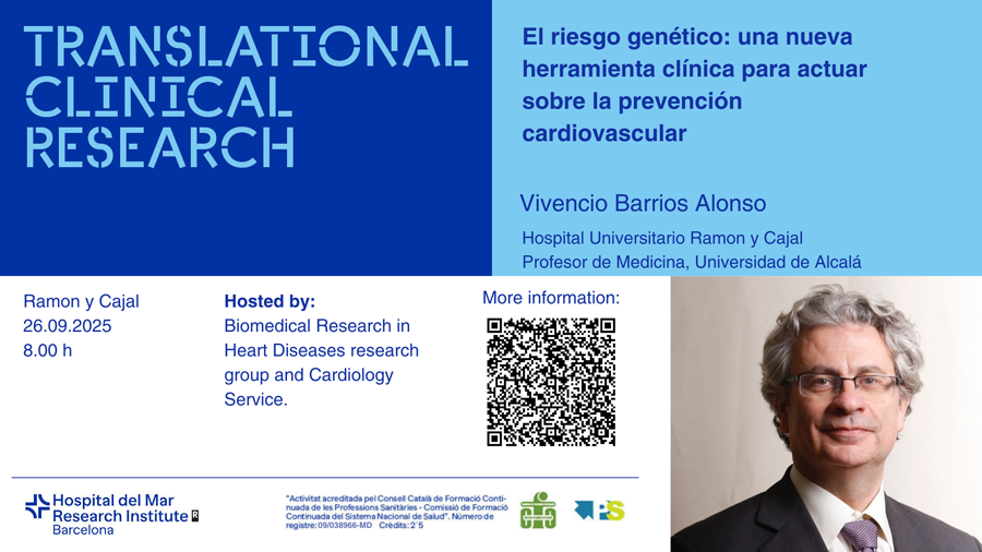 We invite you to the next joint seminar of the Cardiology Department of Hospital del Mar and the Biomedical Research in Heart Diseases Group of the Hospital del Mar Research Institute, which will take place on Friday, September 26, 2025, at 08:00 AM in the Ramon y Cajal Room - PRBB Courtyard.