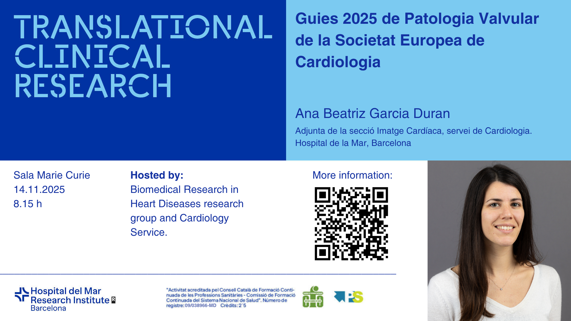 We invite you to the next joint seminar of the Cardiology Department of Hospital del Mar and the Biomedical Research in Heart Diseases Group of the Hospital del Mar Research Institute, which will take place on Friday, November 14, 2025, at 08:15 AM in the Marie Curie Room - PRBB Courtyard.