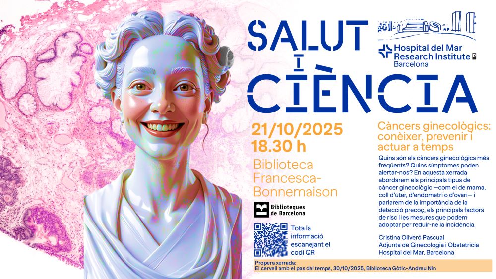 En el marc del Projecte Salut i Ciència en col·laboració amb les biblioteques de Barcelona, us convidem el proper dia 15 d'octubre a la xerrada "Càncers ginecològics: conèixer, prevenir i actuar a temps" a càrrec de Cristina Oliveró Pascual, Adjunta de Ginecologia i Obstetricia- Hospital del Mar, Barcelona.