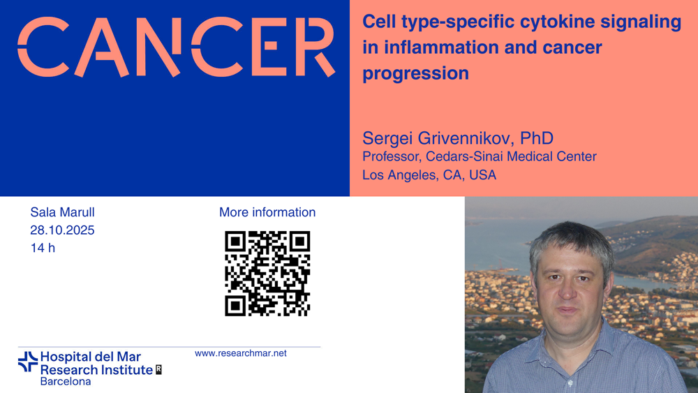 Us convidem al pròxim seminari del programa de Recerca en Càncer que tindrà lloc el dimarts 28/10/2025 a les 14:00h a la Sala Marull. El seminari anirà a càrrec de la Sergei Grivennikov, PhD, Professor, Cedars-Sinai Medical Center; Los Angeles, CA, USA. Porta per títol "Cell type-specific cytokine signaling in inflammation and cancer progression".