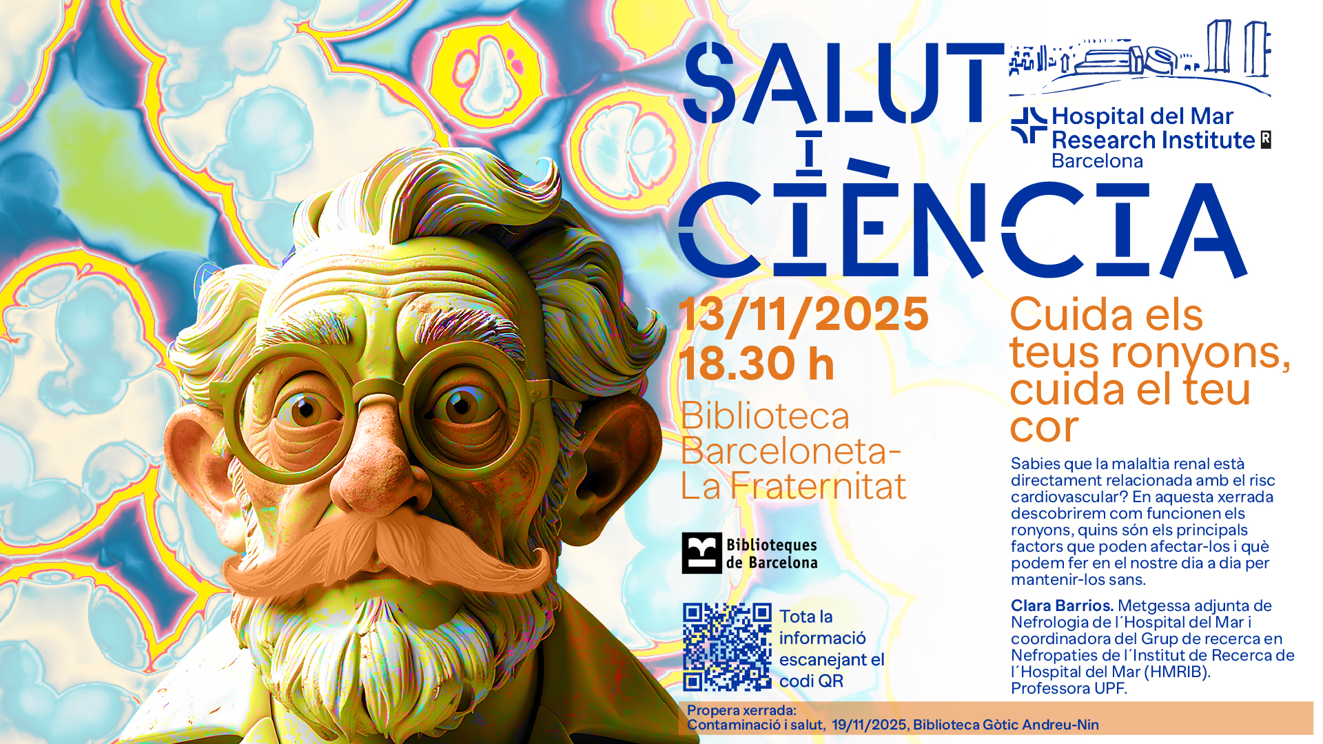 En el marc del Projecte Salut i Ciència en col·laboració amb les biblioteques de Barcelona, us convidem el proper dia 13 de novembre a la xerrada "Cuida els teus ronyons, cuida el teu cor" a càrrec de Clara Barrios. Metgessa adjunta de Nefrologia de l´Hospital del Mar i coordinadora del Grup de recerca en Nefropaties de l´Institut de Recerca de l´Hospital del Mar (HMRIB).