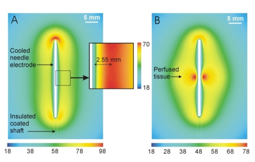 Figura 2. Anàlisi computacional de (Model d'Elements Finits) de la temperatura aconseguida en el teixit a la fi de l'ablació en un sistema convencional d'ablació refredat internament (A) i en el nostre sistema d'ablació (B). El color verd (al voltant de 50 ºC) dóna forma al volum d'ablació final estimat. En el nostre sistema d'ablació (B) s'introdueix solució hipersalina per millorar la forma i la mida de l'ablació, més gran i més esfèrica.